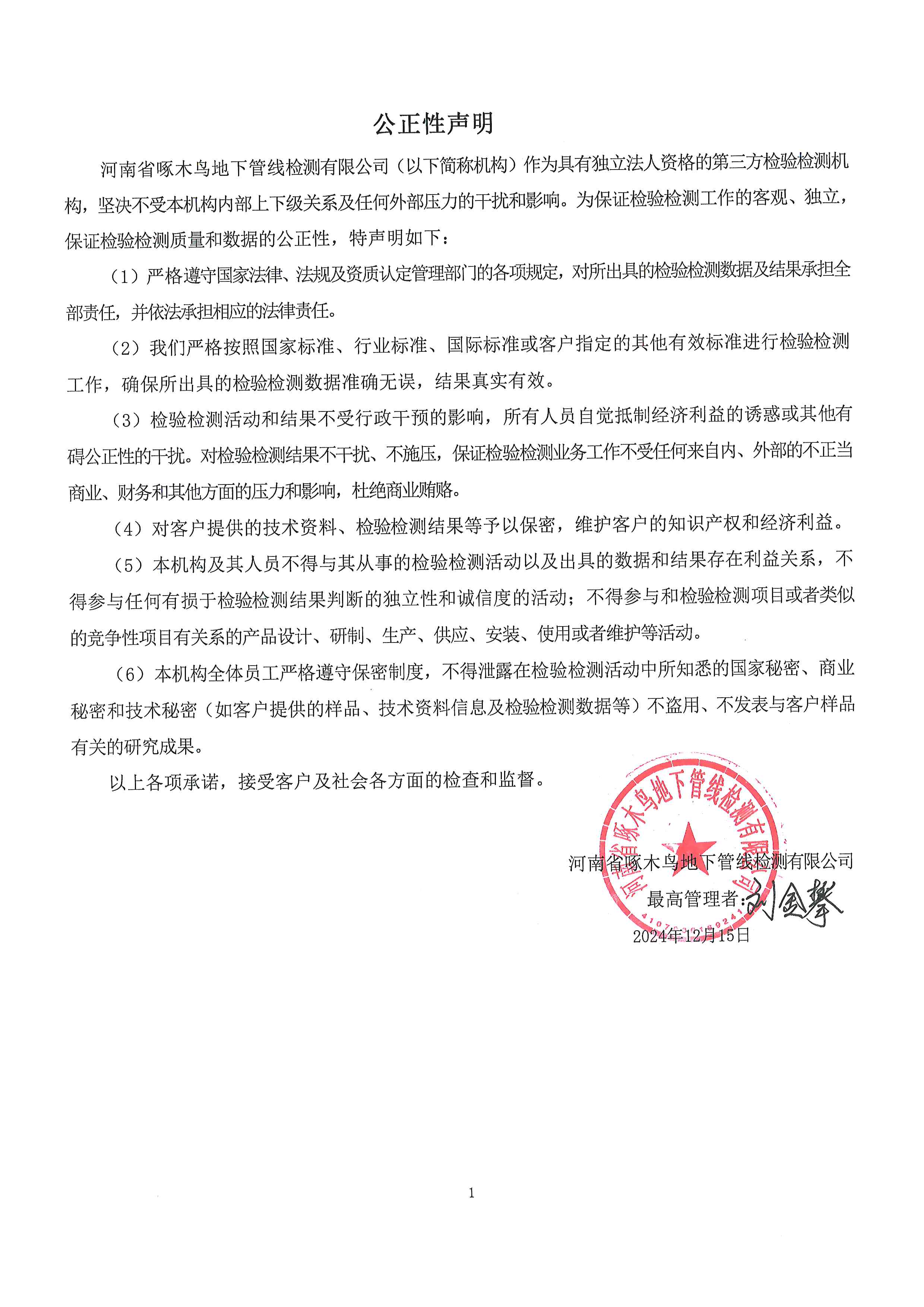 关于河南省啄木鸟地下管线检测有限公司的公正性声明,公示内容如下: